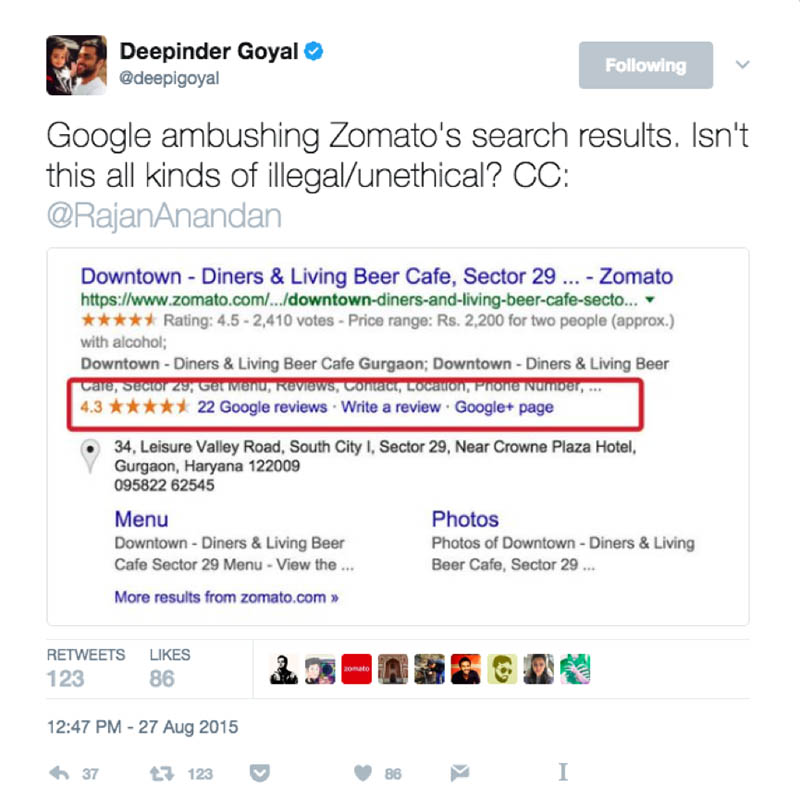 Zomato 公司創(chuàng)始人 Deepinder Goyal在 2015 年 8 月 27 日頒發(fā)的推文截圖