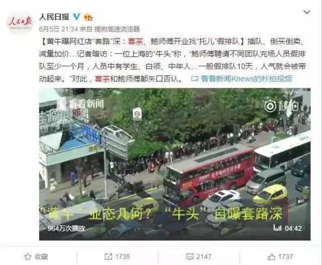 就在你慢慢接受了這個奇葩現(xiàn)象后,一個神轉(zhuǎn)折來了。一段來自看看新聞的視頻顯示,喜茶、鮑師傅其實(shí)都是花錢找“托兒”假排隊!