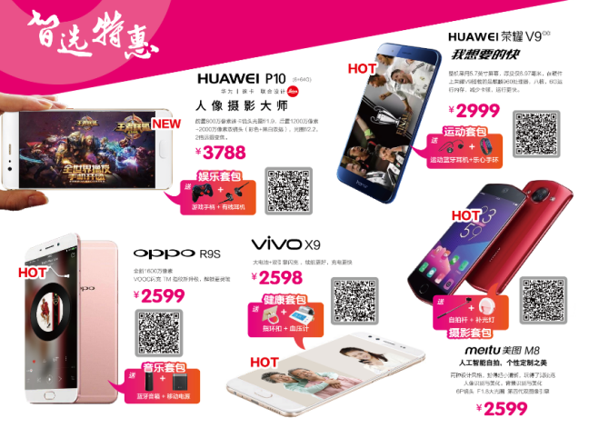 高顏值,華為P10,特惠價(jià)僅需3788;榮耀V9,給你要的快,勁爆價(jià) 2999 元; 撩妹神器,vivo x9,開業(yè)價(jià)僅需 2598 元;全新 1600 萬像素oppor9s,盡享特惠價(jià) 2599 元。暢享低價(jià)還有好禮相送!