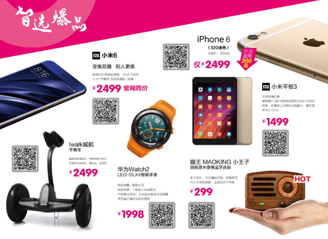 iPhone6 (32G金色)直降 200 元,僅需 2499 元,買到賺到;變焦雙攝,拍人更美的小米6,與官網(wǎng)同價(jià) 2499 元無需等待;I-WALK 威航變速智能體感平衡車,僅需 2499 元即可擁有。