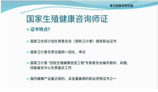 國(guó)家生殖健康咨詢師證,是國(guó)際健康領(lǐng)域最高權(quán)威資格職業(yè)證!也是健康行業(yè)含金量最高的資格證書(shū)之一!生殖健康咨詢師是在生殖健康領(lǐng)域?yàn)閭€(gè)人、家庭或群體提供計(jì)劃生育、優(yōu)生優(yōu)育、母嬰保健等方面信息,開(kāi)展生殖健康教育,診斷生殖健康水平,幫手人們制訂生殖保健促進(jìn)計(jì)劃并協(xié)助落實(shí)的人員!