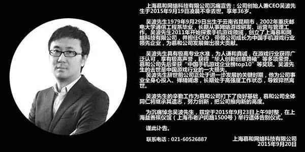 2015年9月19日凌晨,游戲公司慕和網(wǎng)絡年僅36歲的CEO吳波,由于長期處于高強度工作狀態(tài),猝然離世。