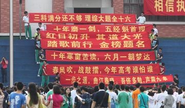 高三黨們躊躇滿志的應(yīng)考標(biāo)語(yǔ)在網(wǎng)絡(luò)上已經(jīng)成為不少段子手發(fā)揮的對(duì)象,“要想成功,必先發(fā)瘋!今日瘋狂,明日輝煌”等標(biāo)語(yǔ)正能量爆棚,“不學(xué)?將來別人壁咚的墻就是你砌的”雖然奇葩卻很勵(lì)志;也有的口號(hào)大膽暢想未來,勾勒出一幅前程似錦的宏偉藍(lán)圖“進(jìn)清華,與主席總理稱兄道弟;入北大,同大家巨匠論道談經(jīng)”。