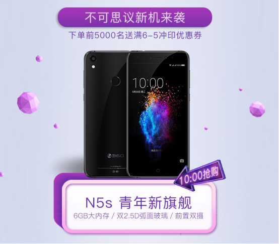 6月7日,360手機將聯(lián)合京東共同開啟品牌日活動,屆時不但有N5s新品現(xiàn)貨發(fā)售,還將有N5系列全線直降、6期白條分期免息券免費領(lǐng)、多類滿減券發(fā)放以及熱門機型6.18元秒殺等,驚爆優(yōu)惠賺足眼球,多重驚喜值得期待。