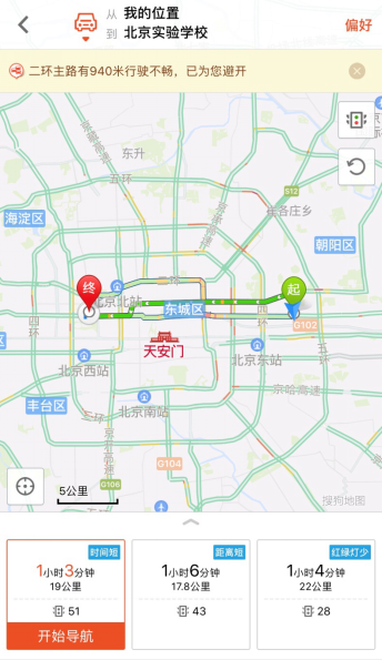 高考期間預計早高峰期間的送考車輛會和社會車流交織,可能會遇到車行緩慢和擁堵情況,考生和家長應盡量提前出發(fā),留出富裕時間,并使用搜狗地圖有效避堵。在搜狗地圖“導航”板塊中,用戶可獲取搜狗手機地圖為其規(guī)劃的多種路線方案,可以看到搜狗手機地圖擇優(yōu)標識的“避堵”路線,預計所用時間、與目的地間的距離以及途徑交通燈的數(shù)目也會顯示在地圖上,駕駛者可獲得更加清晰的導航指引。