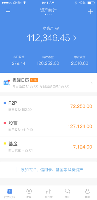 全資產(chǎn)記賬就是把正負(fù)資產(chǎn)通過記賬的方式在一個(gè)APP里進(jìn)行統(tǒng)一辦理。具體說是用戶可以用一個(gè)工具辦理所有資產(chǎn)及負(fù)債,包孕但是不限于網(wǎng)貸、股票、基金、保險(xiǎn)、國債等金融資產(chǎn),以及信用卡、花唄、白條、房貸、車貸等多種負(fù)債賬單,可以實(shí)現(xiàn)理財(cái)產(chǎn)品收益統(tǒng)一查看、掌握投資回款明細(xì)、賬單還款提醒等功能,制止理財(cái)資金站崗、還款逾期等問題。將來通過金融科技對(duì)用戶所留下的資產(chǎn)數(shù)據(jù)進(jìn)行分析,為其提供資產(chǎn)配置的優(yōu)化建議。