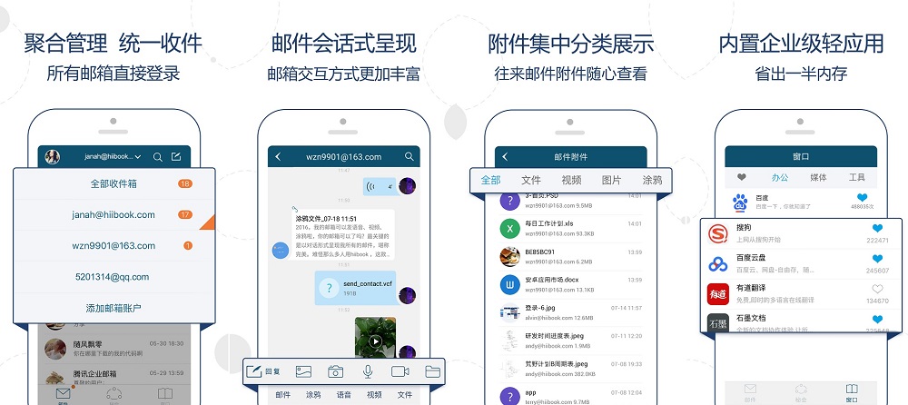 據(jù)公開資料顯示,截止到2016年6月,移動(dòng)電子郵件用戶規(guī)模達(dá)到8億,80%智能手機(jī)用戶每周會(huì)接受電子郵件。既然傳統(tǒng)郵箱無法滿足用戶,尤其是上班族的需求,收發(fā)郵件又貫穿職場(chǎng)的始末,那有沒有一種產(chǎn)品,在取代傳統(tǒng)的同時(shí)又能推陳出新,“一站式”解決辦公室需求? hiibook希望把辦公室裝進(jìn)口袋。hiibook這款郵箱辦理工具實(shí)現(xiàn)了郵箱技術(shù)與即時(shí)通訊技術(shù)的更好融合,不但是創(chuàng)新的第三方郵箱辦理工具,更是極簡(jiǎn)的商務(wù)辦公和職場(chǎng)社交平臺(tái) 。支持綁定網(wǎng)易郵箱、QQ郵箱、企業(yè)郵箱等各種郵箱。