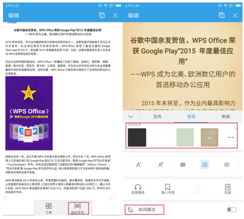 Office進(jìn)行文檔閱讀時(shí),可通過(guò)閱讀模式,改變文檔配景顏色,更可進(jìn)行更替夜間閱讀等操作,實(shí)現(xiàn)護(hù)眼防疲勞等功效。與小屏幕手機(jī)比擬,大屏幕手機(jī)展示的內(nèi)容更多,在閱讀模式下,如同在翻看電紙書。