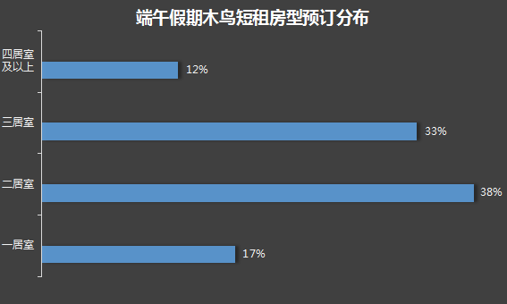如上圖,在端午假期房客類型分布圖可知,兩室房源占比38%,,三室房源占比33%,合計占比高達 7 成。在家庭游和結(jié)業(yè)游群體為主的端午假期,兩室和三室房型也倍受熱捧,預(yù)訂量偏高。