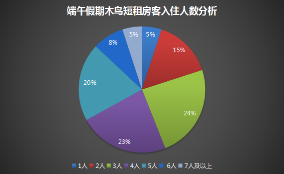 木鳥短租《 2017 端午出游住宿陳訴》顯示, 2 人占比15%,多為情侶、夫妻或者伴侶同住; 3 人占比24%,多為一家三口游玩; 4 人占比23%,多為一家四口或者兩對情侶; 5 人占比20%,多為伴侶或者一家五口。從占比分布不難看出,入住人數(shù)以3- 5 報答主,主要人群為家庭游和集體(結(jié)業(yè))游用戶。