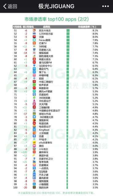 另據(jù)極光數(shù)據(jù)榜單顯示,共享單車應(yīng)用方面,ofo排名第 86 位,超出排名 89 位的摩拜單車 3 個位次,而且排在美團外賣、百度糯米、搜狗搜索等熱門App之前。意味著,在共享單車行業(yè)競爭中,ofo小黃車的市場滲透率更高,用戶群體使用更加遍及,發(fā)展優(yōu)勢更加明顯。