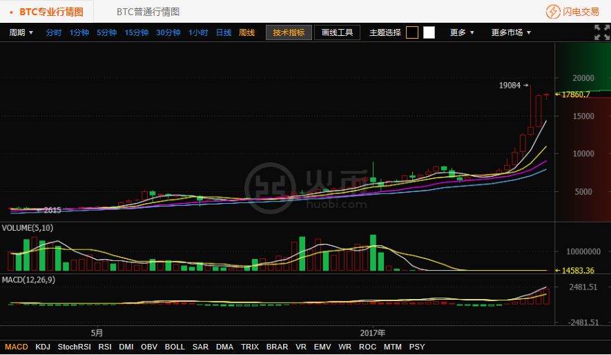 火幣網(wǎng)比特幣上周比特幣始于13532. 03 元,收于17650. 03 元,最高點(diǎn)到達(dá)17888. 88 元,最低點(diǎn)為 13400 元,全周漲幅為4488. 88 元,交易量為 100375 比特幣,漲幅30.45%,振幅33.5%。上周漲幅為近期周行情最大漲幅,漲幅與振幅基本一致。周線收出實(shí)體陽(yáng)線,成交量較上周有所減少,表白大幅調(diào)整后一致預(yù)期向上,本周有望重新挑戰(zhàn)新高。