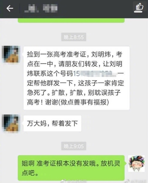 據(jù)了解,此類詐騙信息的模版一般是:“伴侶撿到一個準(zhǔn)考證,有認(rèn)識的通知一下:姓名:劉明煒,考點:一中,考場:013,座號:11,準(zhǔn)考證號:204101311。聯(lián)系電話18735078xxx。擴散,擴散,別耽誤孩子高考”。