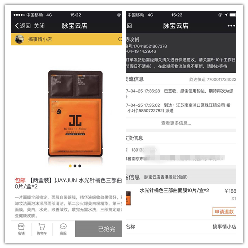 作為一個(gè)普通消費(fèi)者,我只關(guān)注三點(diǎn),東西是不是正品?價(jià)格跟其他平臺比有沒有優(yōu)勢?物流快煩懣?于是我抱著試試看的心理下單了 2 盒水光針三部曲面膜,特意看了一下,是從香港發(fā)貨,心想,好歹也一個(gè)星期才能收到吧!