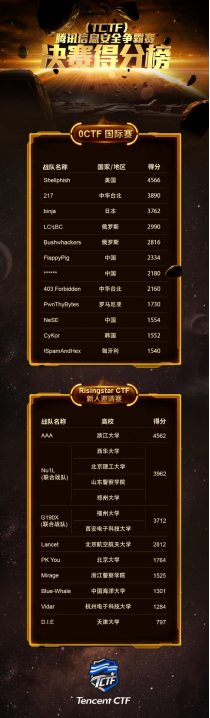 6 月 3 日,經(jīng)過兩天激戰(zhàn),首屆騰訊信息安適爭霸賽(TencentCapture TheFlag,簡稱TCTF)在深圳圓滿落下帷幕。最終,來自美國的Shellphish戰(zhàn)隊力挫群雄,問鼎TCTF國際賽(0CTF)冠軍,中華臺北 217 戰(zhàn)隊和日本binja戰(zhàn)隊分列二三名。浙江大學AAA戰(zhàn)隊以 4562 分的成績奪得TCTF新人邀請賽(RisingstarCTF)冠軍,榮獲由騰訊安適提供的DEF CON之旅。