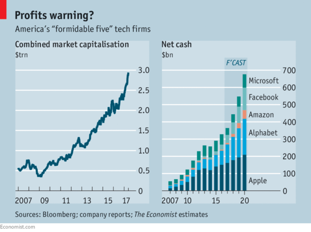 科技公司的價(jià)值高估曾經(jīng)被視為瘋狂的征兆。而如今的投資者認(rèn)為,他們做出的判斷非常冷靜——這些科技公司是 21 世紀(jì)的主要寡頭壟斷企業(yè),將會(huì)獲得巨大的、節(jié)節(jié)高升的利潤(rùn)。然而,一個(gè)疑慮仍然令人不安:這五大科技巨頭的資產(chǎn)負(fù)債表上有大量現(xiàn)金,給人的感覺好像是它們并不想主宰世界,而是預(yù)計(jì)會(huì)有危機(jī)發(fā)生,想要未雨繆綢。