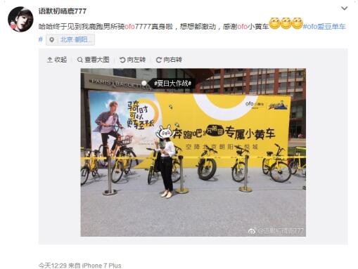 而對于鹿飯們來說,如果其愛豆同款車還不足以滿足對鹿Boss的喜愛,那么不妨事到ofo的線下活動地點來跟奔跑吧伐木累的專屬小黃車們合照,更多有關(guān)鹿Boss與伐木累的信息,ofo一次滿足你。目前ofo小黃車已經(jīng)在其官方微博上發(fā)布了活動信息, 2017 年 6 月 3 日至 6 月 4 日,伐木累成員專屬小黃車將在北京朝陽大悅城南廣場現(xiàn)身,到這里不但將能見到愛豆們騎過的小黃車,還能博得來自ofo與愛豆們的驚喜大禮包。當(dāng)然,如果能選擇騎著ofo小黃車來到活動場地,那才是最完美的。