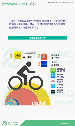 國內(nèi)權(quán)威的第三方移動數(shù)據(jù)機構(gòu)極光大數(shù)據(jù)最新發(fā)布了《app風(fēng)云榜—— 4 月app榜單》顯示,共享單車行業(yè)的彩虹大戰(zhàn)依舊如火如荼,以黃橙為主力,遠遠領(lǐng)先第二集團的永安行、酷騎單車、小藍單車等品牌。其中,ofo市場滲透率為4.04%,位居行業(yè)第一,力壓摩拜單車的3.87%市場滲透率。更值得一提的是,ofo的滲透率始終連結(jié)著較快的增速,成為 4 月整個榜單中的最大黑馬;摩拜排位上升也較快,但仍落后于ofo。
