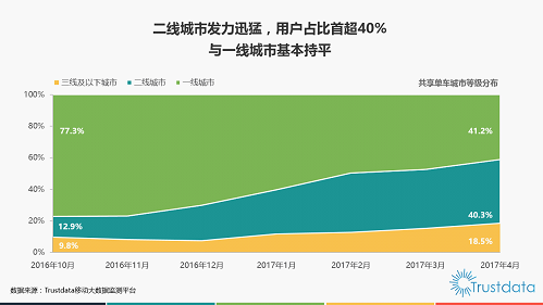 實際上,隨著共享單車的發(fā)展,二線城市的單車投放量逐漸擴大,按照另一第三方權威數據機構Trustdata的統(tǒng)計,二線城市共享單車用戶占比幾乎與一線城市齊平。本年 4 月,二線城市用戶規(guī)模占比達到40.3%,比去年 10 月提高了27. 4 個百分點,漲幅明顯。二線城市已成為共享單車最重要的增量市場,ofo小黃車擁有最高的城市覆蓋數,這意味著小黃車的行業(yè)優(yōu)勢明顯。