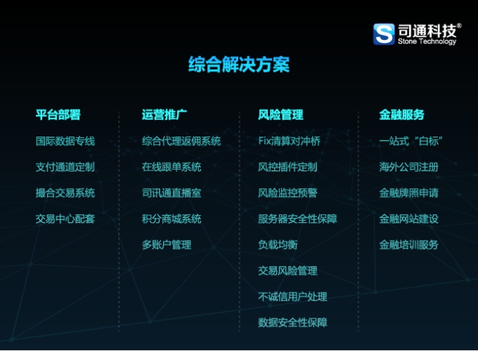 司通科技深耕金融軟件辦事行業(yè) 10 年,專注于MT4 平臺搭建、MT4 期權(quán)交易系統(tǒng)、移動交易系統(tǒng)開發(fā)等辦事,能夠一站式為客戶提供全方位金融解決方案。目前,全球已有 500 多家金融機構(gòu)、經(jīng)紀商在使用司通產(chǎn)品高效開展金融事業(yè)。