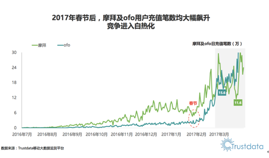 在日充值筆數(shù)方面,ofo摩拜在 2017 年春節(jié)后均呈現(xiàn)大幅上漲的態(tài)勢(shì),兩者縮小差距。在 3 月,,ofo日充值筆數(shù)明顯持續(xù)超越了摩拜。