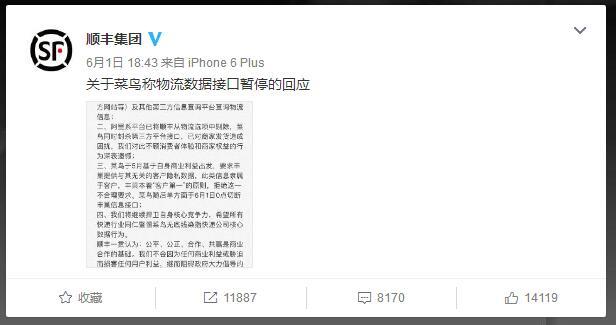 到了下午 6 點(diǎn)多,順豐則發(fā)聲明反嗆:不是順豐關(guān)閉菜鳥(niǎo)數(shù)據(jù)接口,而是阿里系平臺(tái)封殺了順豐。