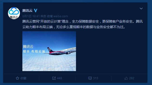 俗話(huà)說(shuō)得好,“敵人的敵人就是伴侶”,在菜鳥(niǎo)和順豐兩家鬧得不成開(kāi)交的時(shí)候,昨日晚間,騰訊云官方也站出來(lái)說(shuō)話(huà),公開(kāi)發(fā)微博體現(xiàn):