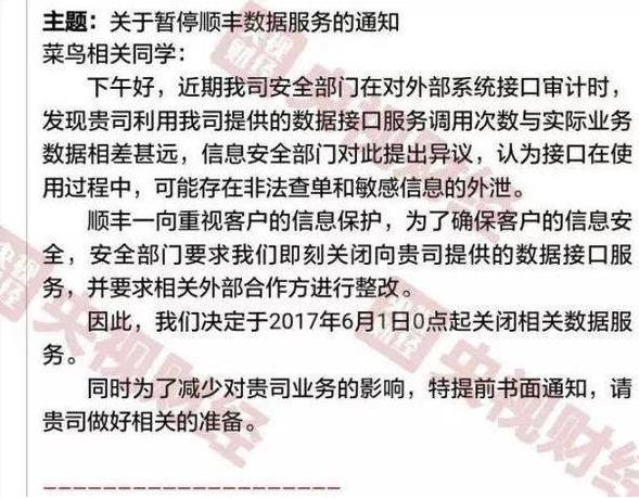 我們現(xiàn)在還不知道雙方前期溝通的細(xì)節(jié),只能通過事發(fā)之后雙方的聲明來獲取一些信息的碎片?,F(xiàn)在公開信息能追溯的最早時間點(diǎn),是順豐方面公開的一封郵件,發(fā)送于5約31日下午6點(diǎn)。這不是一封溝通郵件,更像是溝通無果之后的一封最后通牒。