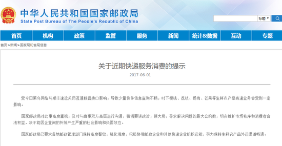國家郵政局體現(xiàn)對此事的高度重視,已及時與當(dāng)事雙方高層進(jìn)行溝通,強(qiáng)調(diào)要講政治,顧大局,尋求解決問題的最大公約數(shù),切實維護(hù)市場秩序和消費者合法權(quán)益,決不能因企業(yè)間的糾紛產(chǎn)生嚴(yán)重的社會影響和負(fù)面效應(yīng)。