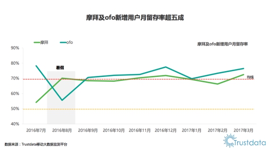 最新數(shù)據(jù)也顯示,自去年 9 月進(jìn)入城市后,ofo新增用戶的月留存率始終高于行業(yè)70%的平均水平,且連續(xù) 7 個月超越摩拜的新增用戶月留存率。
