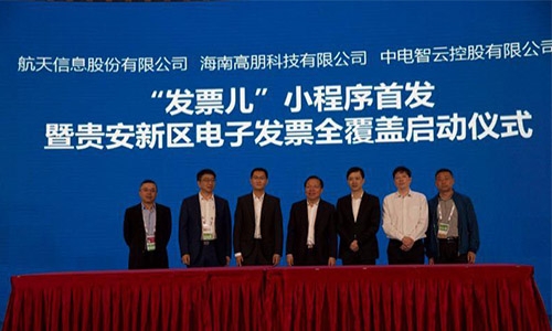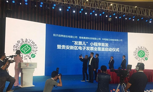 發(fā)布現(xiàn)場(chǎng),在貴州省省委常委、常務(wù)副省長(zhǎng)秦如培,騰訊公司董事會(huì)主席馬化騰、貴州省政府副秘書長(zhǎng)、省大數(shù)據(jù)局局長(zhǎng)馬寧宇等領(lǐng)導(dǎo)的共同見證下,由航天信息股份有限公司貴州公司總經(jīng)理張冠聰、海南高朋科技有限公司董事長(zhǎng)高峽、中電智云控股有限公司董事長(zhǎng)張岱,貴安新區(qū)國(guó)稅局局長(zhǎng)車俊一起共同發(fā)布了全國(guó)首張通過微信小程序開具的電子發(fā)票,同時(shí)在會(huì)上頒布頒發(fā)貴安新區(qū)成為全國(guó)首個(gè)全區(qū)啟動(dòng)電子發(fā)票的區(qū)域。