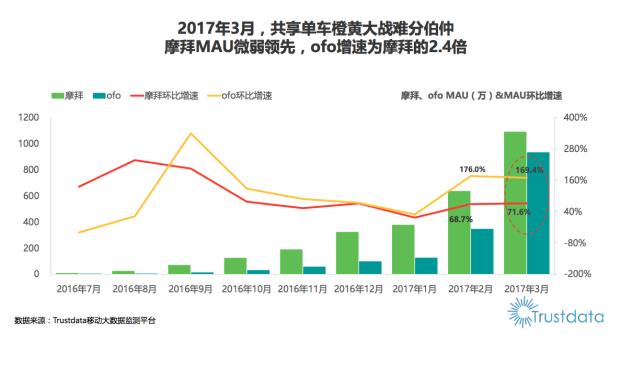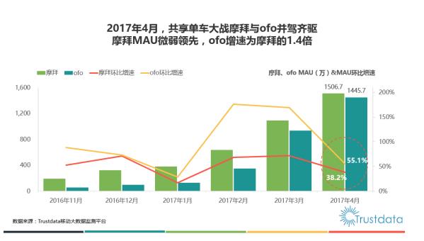 在共享單車行業(yè)競爭格局方面,Trustdata最新 4 月數(shù)據(jù)顯示:ofo4 月用戶環(huán)比增速高達(dá)55.1%,高于摩拜的38.2%,ofo月度用戶增速為摩拜的1. 4 倍,強(qiáng)勢領(lǐng)騎行業(yè)新風(fēng)向。