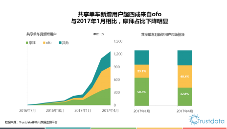 除了市民對端午節(jié)騎ofo的用戶更多的直不雅觀感受外,Trustdata移動(dòng)大數(shù)據(jù)平臺監(jiān)測數(shù)據(jù)也客不雅觀反映了這一結(jié)論。據(jù)Trustdata數(shù)據(jù)顯示,本年 4 月,共享單車行業(yè)月新增用戶超 1200 萬,其中超過 4 成用戶來自ofo小黃車,ofo用戶增速為摩拜的1. 4 倍,繼續(xù)連結(jié)增長最快的共享單車平臺地位。與 2017 年 1 月比擬,摩拜月新增用戶占比從50.8%,下降至32.8%,而ofo小黃車月新增用戶占比達(dá)到40.4%,是摩拜單車的近1. 3 倍,可見ofo小黃車的行業(yè)領(lǐng)軍地位十分安靖。