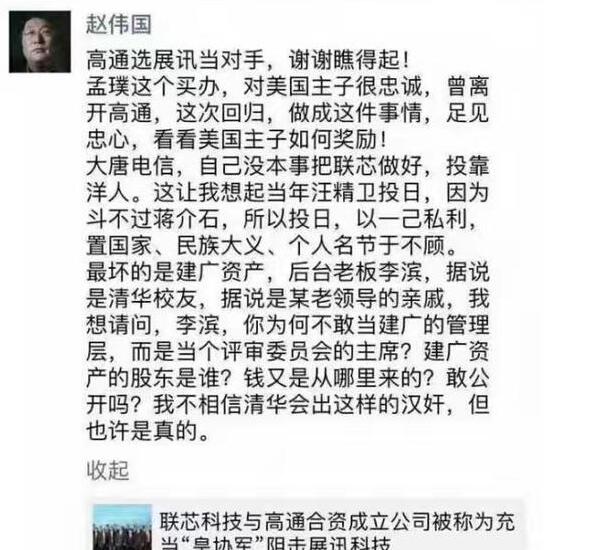 但令業(yè)內(nèi)沒有想到的是,就是這樣一件在當(dāng)下芯片產(chǎn)業(yè),尤其是中國芯片產(chǎn)業(yè)競合求發(fā)展的今天相當(dāng)正常的合作,卻引發(fā)了素有中國芯片產(chǎn)業(yè)“國家隊(duì)”之稱的清華紫光的暗諷,更讓我們感到震驚的是,紫光集團(tuán)董事長趙偉國竟然親自發(fā)文炮轟此次合作中的高通中國CEO孟璞是買辦,聯(lián)芯投靠洋人,讓其想起了汪精衛(wèi)投日。那么究竟是什么原因能讓趙偉國這個(gè)在中國,乃至全球芯片產(chǎn)業(yè)稱之為“餓虎”(因?yàn)榀偪癫①徬嚓P(guān)芯片廠商而得名)人物親自發(fā)文炮轟,甚至在炮轟中不惜夾雜對(duì)于個(gè)人的攻擊?