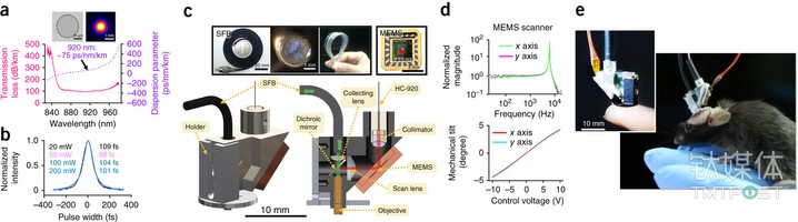“從微型化、分辨率、成像速度綜合來看是國際領先的?!北本┐髮W分子醫(yī)學研究所程和平院士介紹稱,該顯微鏡采用雙軸對稱高速微機電系統(tǒng)轉鏡掃描技術,成像幀頻達 40Hz(256*256 像素),具備多區(qū)域隨機掃描和每秒 1 萬線的線掃描能力;并采用了自主研發(fā)設計的光子晶體光纖,可實現 920nm 激光傳輸;熒光信號的接收則采用自主研發(fā)的柔性光纖束,制止了動物活動時熒光傳輸光纜拖拽而受到干擾的難題。