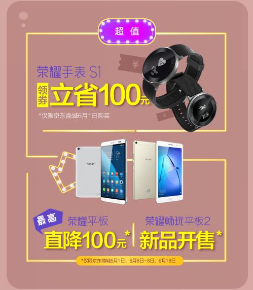 ? 榮耀平板最高直降 100 元,僅限京東商城 6 月 1 日、 6 月6- 8 日、 6 月 18 日,共五天。