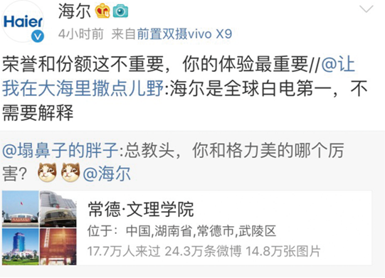 海爾新媒體運(yùn)營(yíng)和公關(guān)的能力早已被業(yè)界認(rèn)可,海爾“走紅三部曲”及海爾“不跟杜蕾斯比”的相關(guān)內(nèi)容也刷屏了新媒體營(yíng)銷(xiāo)人士的伴侶圈。海爾作為全球白電巨頭,按照最新公布的財(cái)報(bào)顯示,集團(tuán)整體營(yíng)收達(dá)2016億,連續(xù)八年全球大型家電市場(chǎng)份額第一!這個(gè)白電“老大哥”也是消費(fèi)者心中當(dāng)之無(wú)愧的第一名!但讓筆者覺(jué)得更“6”的,卻是海爾官微的下一條回復(fù):比擬榮譽(yù)和份額,海爾最在意的是用戶(hù)的體驗(yàn)。