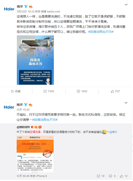 這個(gè)看似低調(diào)的回復(fù),卻把海爾的品牌詮釋的淋漓盡致,海爾品牌所在意的用戶(hù)體驗(yàn)以及真誠(chéng)到永遠(yuǎn)的理念在新媒體運(yùn)營(yíng)上可見(jiàn)一斑。近期,海爾官微在微博上發(fā)起了進(jìn)行空調(diào)免費(fèi)深度清洗辦事的辦事,抽送的5個(gè)名額吸引了全國(guó)各地4000多用戶(hù)進(jìn)行參與和互動(dòng)。原本線(xiàn)下付費(fèi)的清洗辦事在新媒體平臺(tái)上不但用免費(fèi)名額來(lái)吸引用戶(hù)參與,采用用戶(hù)喜聞樂(lè)見(jiàn)的傳播形式強(qiáng)化了海爾辦事貼心的同時(shí),對(duì)用戶(hù)體驗(yàn)進(jìn)行了有效的升級(jí)。用戶(hù)需求不停上升,海爾官微也順勢(shì)將免費(fèi)清洗辦事的名額增加到30個(gè)。活動(dòng)結(jié)束后,共吸引了近萬(wàn)名用戶(hù)進(jìn)行參與及互動(dòng)!值得一提的是,海爾官微此次活動(dòng),不局限于提升海爾用戶(hù)的體驗(yàn),清洗的空調(diào)品牌不限,豈論是友商還是競(jìng)品,都可以提供該項(xiàng)辦事。這一細(xì)節(jié),也不得不讓人佩服海爾品牌大氣的包容力,無(wú)差另外用戶(hù)體驗(yàn)提升理念!