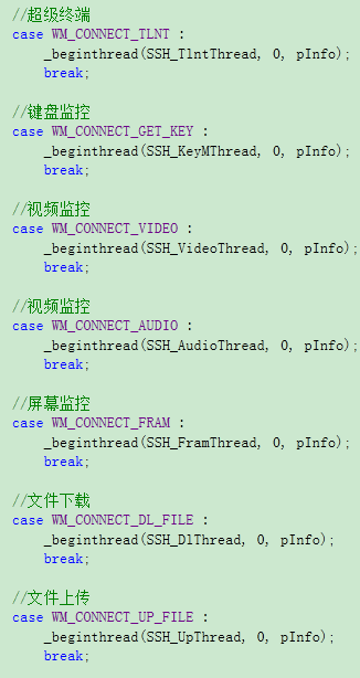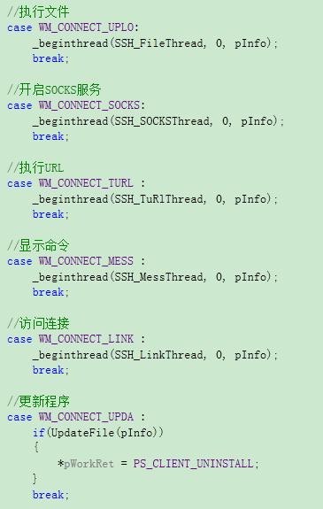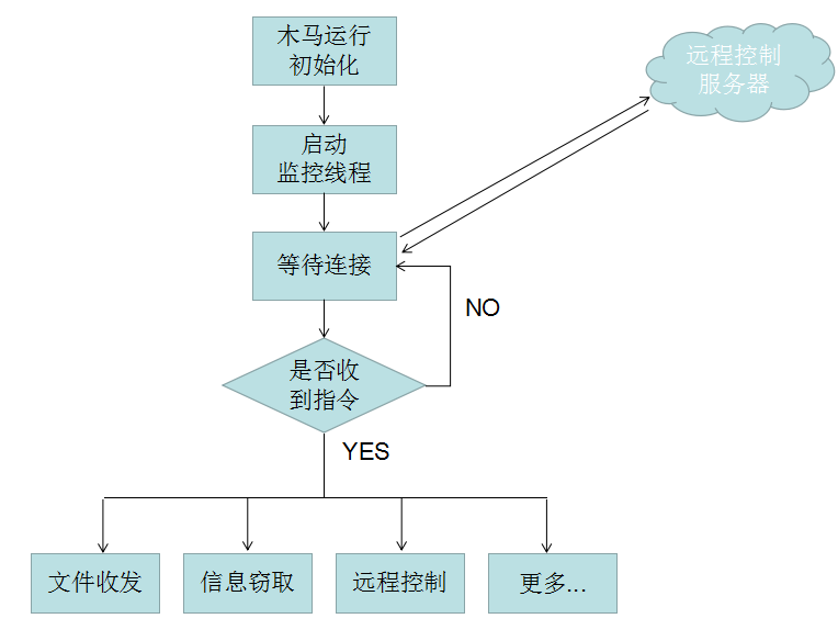 木馬運(yùn)行之后,執(zhí)行初始化操作,初始化完成之后創(chuàng)建監(jiān)聽線程等待遠(yuǎn)程控制辦事器連接。按照遠(yuǎn)程發(fā)來的指令執(zhí)行差別的功能。