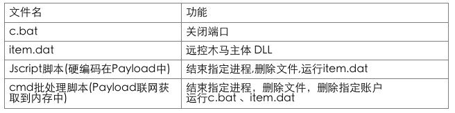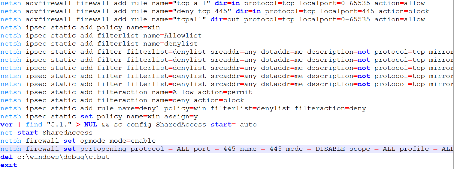 c.bat的主要功能是關(guān)閉端口,防止利用同樣漏洞的病毒再進(jìn)入受害者計(jì)算機(jī),導(dǎo)致本身的遠(yuǎn)控?zé)o法正常工作。