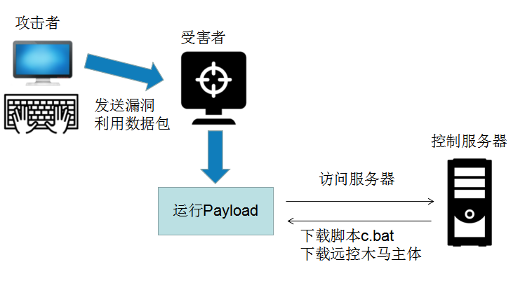 攻擊者 首先通過網(wǎng)絡(luò) 向被攻擊目標(biāo),發(fā)送可以觸發(fā)漏洞的網(wǎng)絡(luò)數(shù)據(jù)流。一旦攻擊成功,攻擊者將通過這條通道,發(fā)送一個(gè)二進(jìn)制DLL文件,完成進(jìn)一步的控制,下文中我們將此文件稱作Payload。