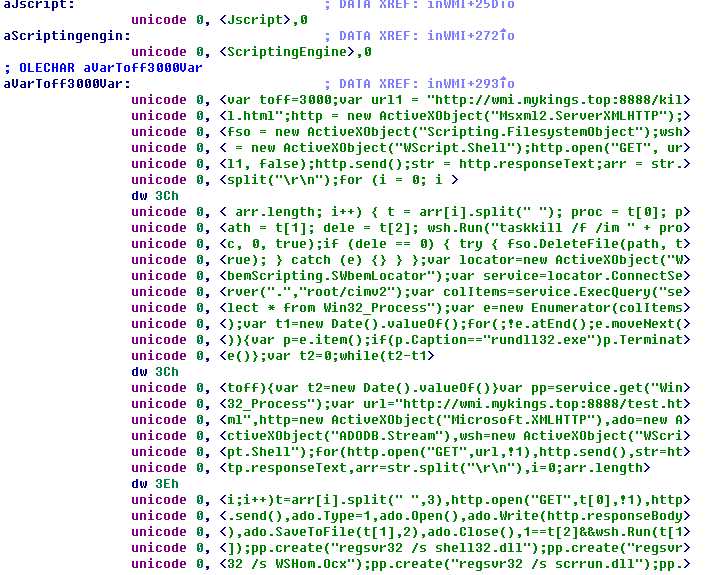 3、Payload運(yùn)行之后首先調(diào)用InWMI 函數(shù)將硬編碼的Jscript腳本注冊(cè)為WMI中的永久事件消費(fèi)者。當(dāng)與其綁定的時(shí)間到達(dá)時(shí),就會(huì)被觸發(fā)執(zhí)行預(yù)先定義好的Jscript腳本,此方式較為隱蔽。