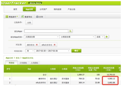 按照第三方權(quán)威數(shù)據(jù)機(jī)構(gòu)艾瑞最新mUserTracker后臺(tái)數(shù)據(jù)顯示,比擬摩拜,ofo用戶整體呈現(xiàn)更高頻的使用特性。在周度總使用次數(shù)這一關(guān)鍵數(shù)據(jù)上,ofo比摩拜單車高出20%;ofo單個(gè)用戶周總使用頻次是摩拜的2. 5 倍;ofo單個(gè)用戶平均使用天數(shù)是摩拜的1. 4 倍。