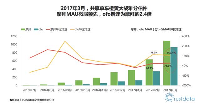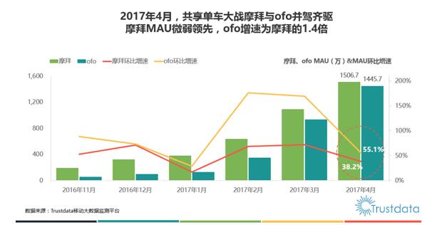 需注意的是,Trustdata發(fā)布的《 2017 年Q1 中國共享單車行業(yè)用戶監(jiān)測陳訴》數據顯示,ofo月活用戶的環(huán)比增速已連續(xù) 7 個月超越摩拜。如今,ofo4 月用戶增速再次超越摩拜,創(chuàng)下用戶增速連續(xù) 8 個月超越摩拜的行業(yè)領先新記錄,持續(xù)成為增長最快的共享單車平臺。
