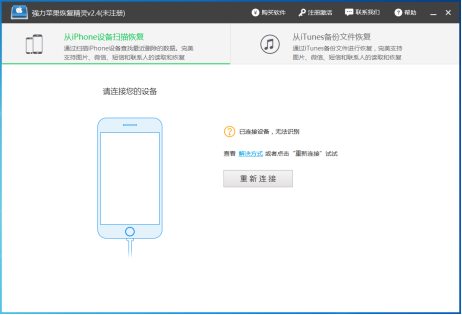 4.在軟件界面中選擇“從iTunes備份文件恢復(fù)”功能,軟件將會(huì)檢測(cè)電腦上的備份設(shè)備,如果您沒(méi)有使用iTunes備份過(guò)蘋果手機(jī)數(shù)據(jù),請(qǐng)選擇iPhone設(shè)備掃描恢復(fù)。點(diǎn)擊連接在電腦上的設(shè)備,,再點(diǎn)擊開始掃描。