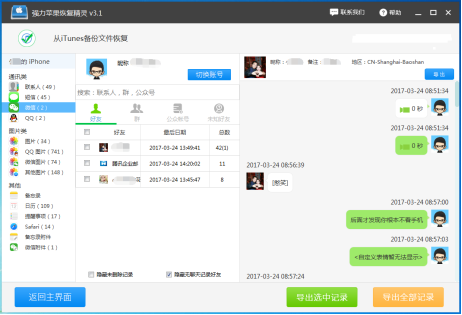 5.掃描完成后,在軟件左側(cè)可以看到聯(lián)系人、短信、微信等。右下角別離是“導(dǎo)出選中記錄”和“導(dǎo)出全部記錄”。