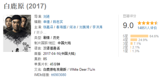 電視劇《白鹿原》現(xiàn)已播出了三分之一的劇集,雖然收視率遠(yuǎn)不敵《歡樂頌2》,但口碑卻相當(dāng)了得,豆瓣評分高達(dá)九分,該劇藝人的飾演也頗具亮點。張嘉譯、何冰這些老戲骨的演技沒得說。這部劇立項16年,幾經(jīng)轉(zhuǎn)折,耗資3億。它的口碑、標(biāo)準(zhǔn)之大,比《人民的名義》有過之而無不及。