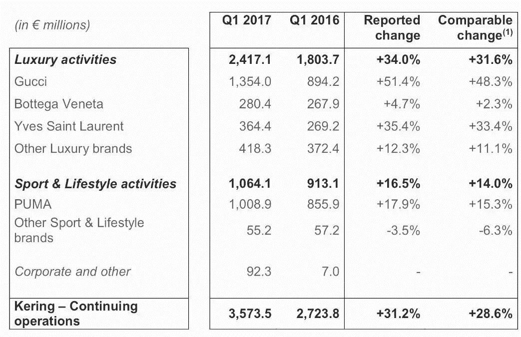 雖然頻繁關(guān)店,但Gucci近來業(yè)績表示不錯(cuò),據(jù)Gucci母公司開云集團(tuán)公布2017年第一季度財(cái)報(bào),GUCCI收入錄得猛漲51%至13.54億歐元,同比增長48.3%,是20年來最強(qiáng)勁的增長,為開云集團(tuán)貢獻(xiàn)了三分之一以上收入。