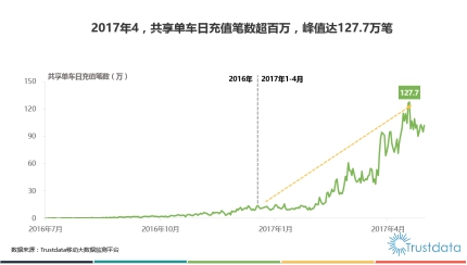 亮點二:共享單車盈利前景明朗。 據Trustdata統(tǒng)計, 2017 年 4 月,共享單車用戶日充值筆數繼續(xù)連結快速增長勢頭,峰值達127. 7 萬筆,周末及節(jié)假日會出現階段性高峰。隨著用戶付費習慣的不停強化,共享單車的盈利前景日漸明朗。