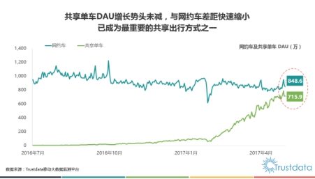 Trustdata最新數據還反映了共享單車行業(yè)的整體發(fā)展趨勢,隨著共享單車開創(chuàng)的“最后一公里”深度滿足市民短途出行需求,低碳環(huán)保的出行理念日漸深入人心,共享單車已成為最重要的共享出行方式之一。 2017 年 4 月,共享單車用戶規(guī)模連結強勁增長勢頭,用戶規(guī)模已經接近網約車,成為最重要的共享出行方式之一。根據目前的增長趨勢, 2017 年第二季度末,共享單車有望超越網約車,成為用戶規(guī)模最大的共享出行方式。